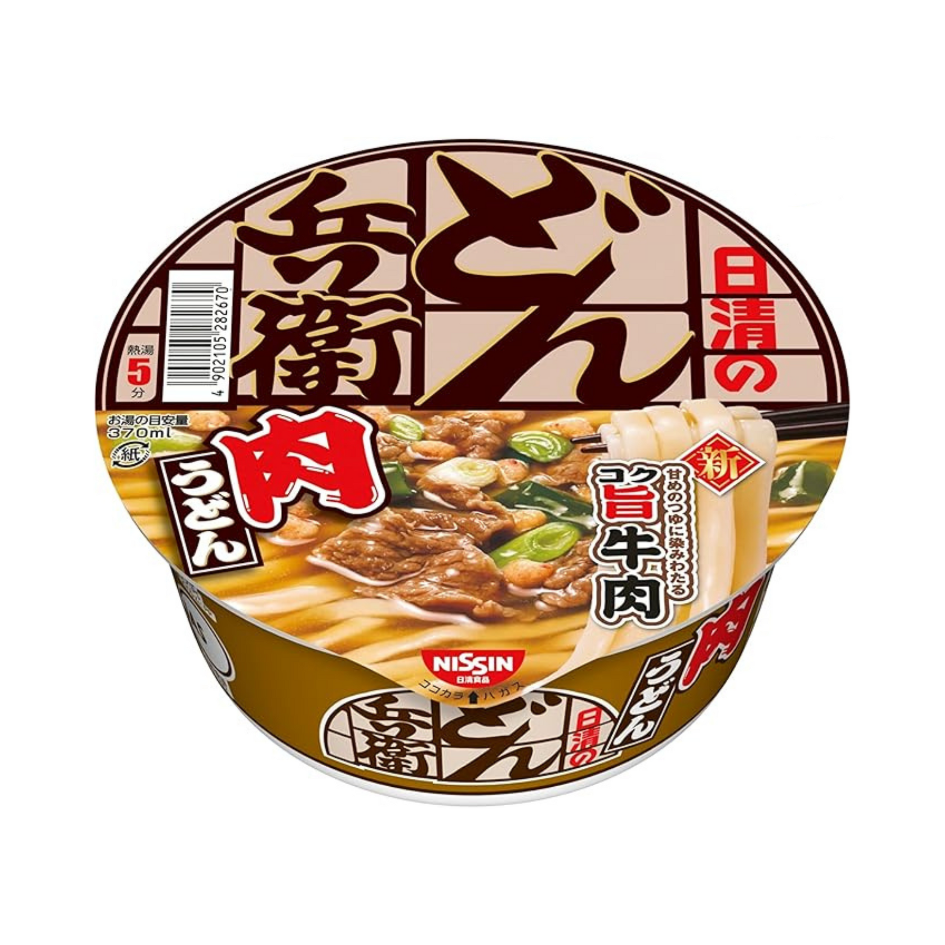 Nissin’s Donbei Niku Udon features chewy udon noodles in a mildly sweet soy sauce–based broth. Topped with seasoned beef, green onions, wakame seaweed, and crunchy tempura bits.
