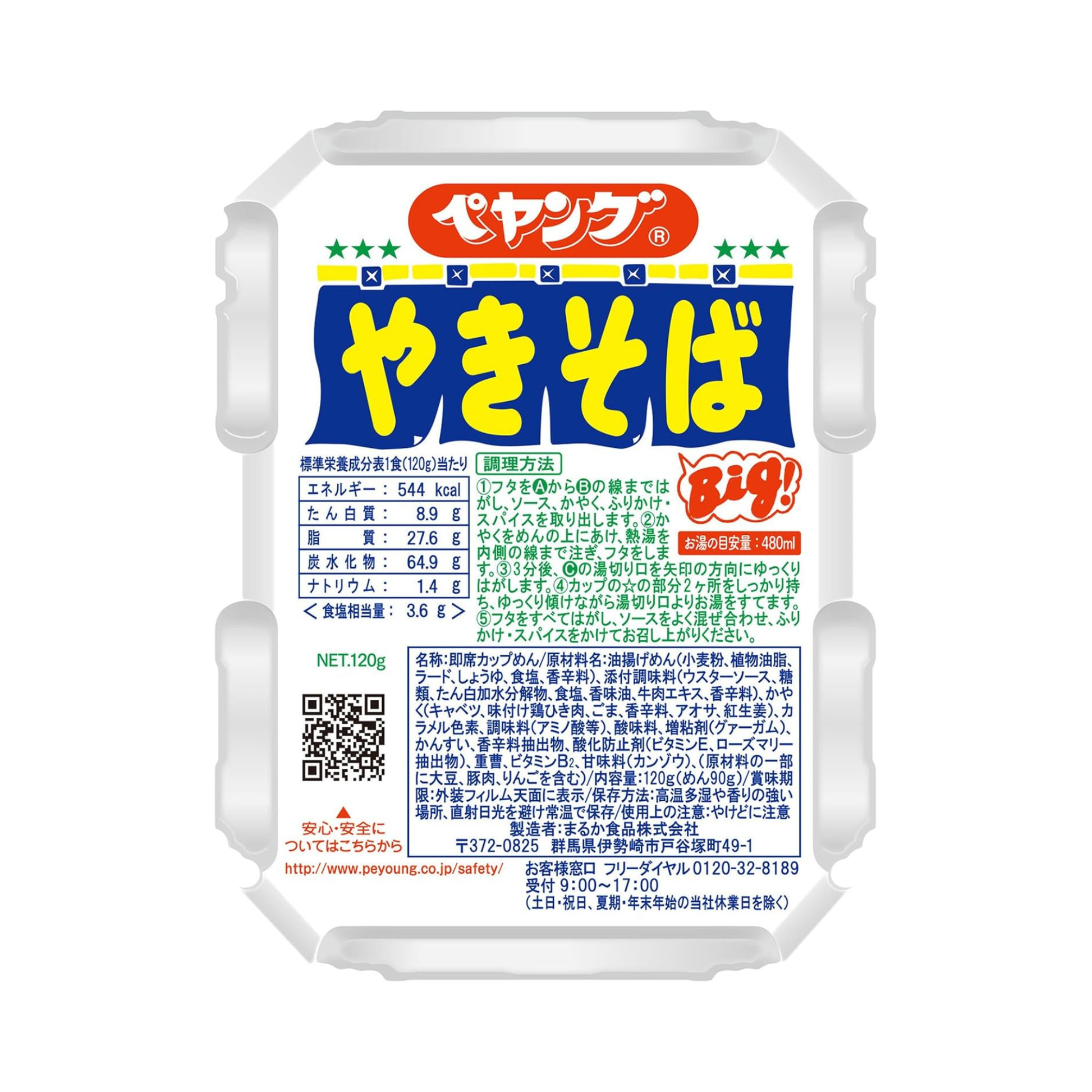 Ingredients (major): fried noodles (wheat flour, lard, vegetable oil, salt, soy sauce, spices), seasoning sauce (Worcestershire sauce, sugars, protein hydrolysate, etc.), garnish (cabbage, ground chicken, sesame, etc.)